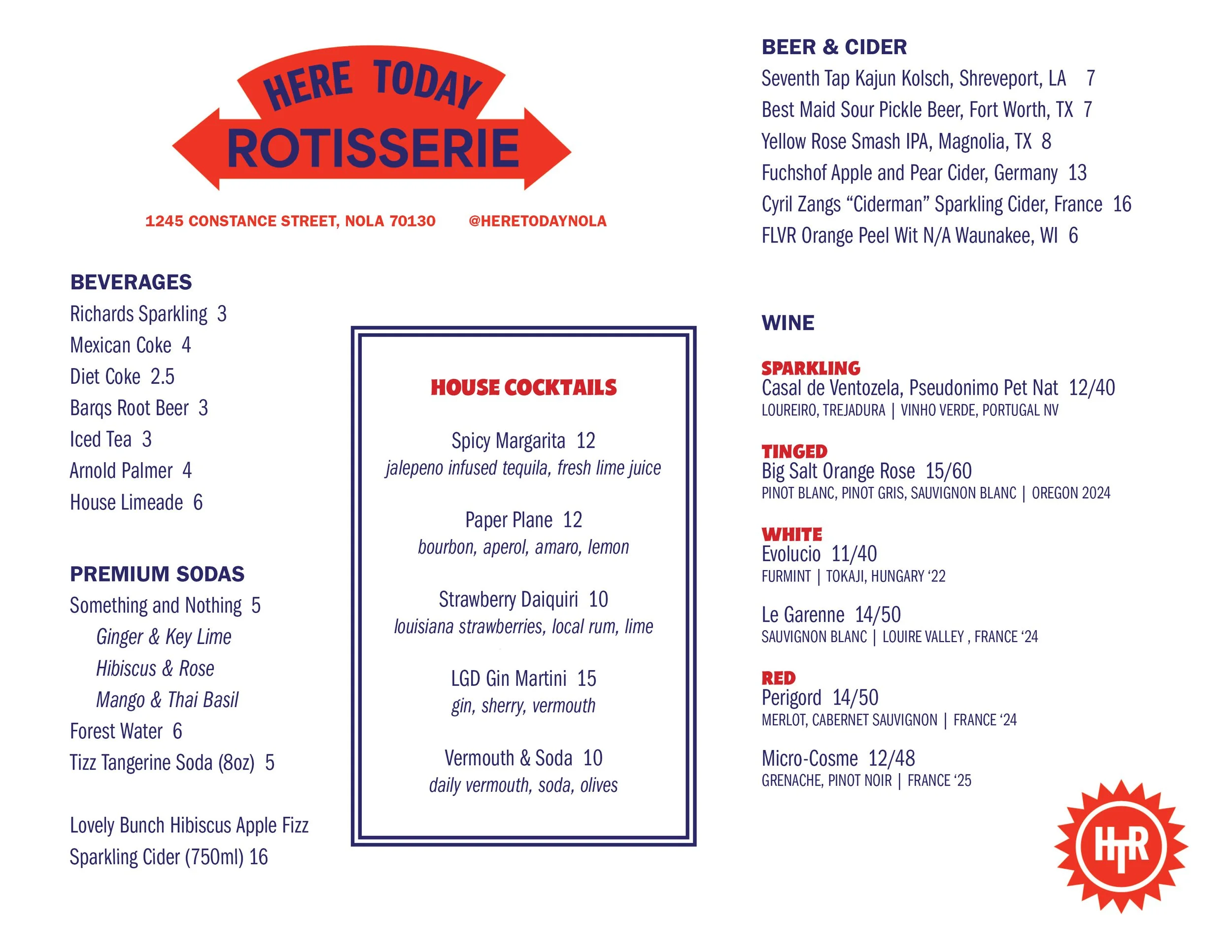 Here Today serves one menu daily for lunch and dinner. We offer weekly rotating specials. Red Beans and Rice bowls are on Mondays and Friday features our Fried Chicken. Menus subject to change. For the most current offerings please go to Toast Local, here.